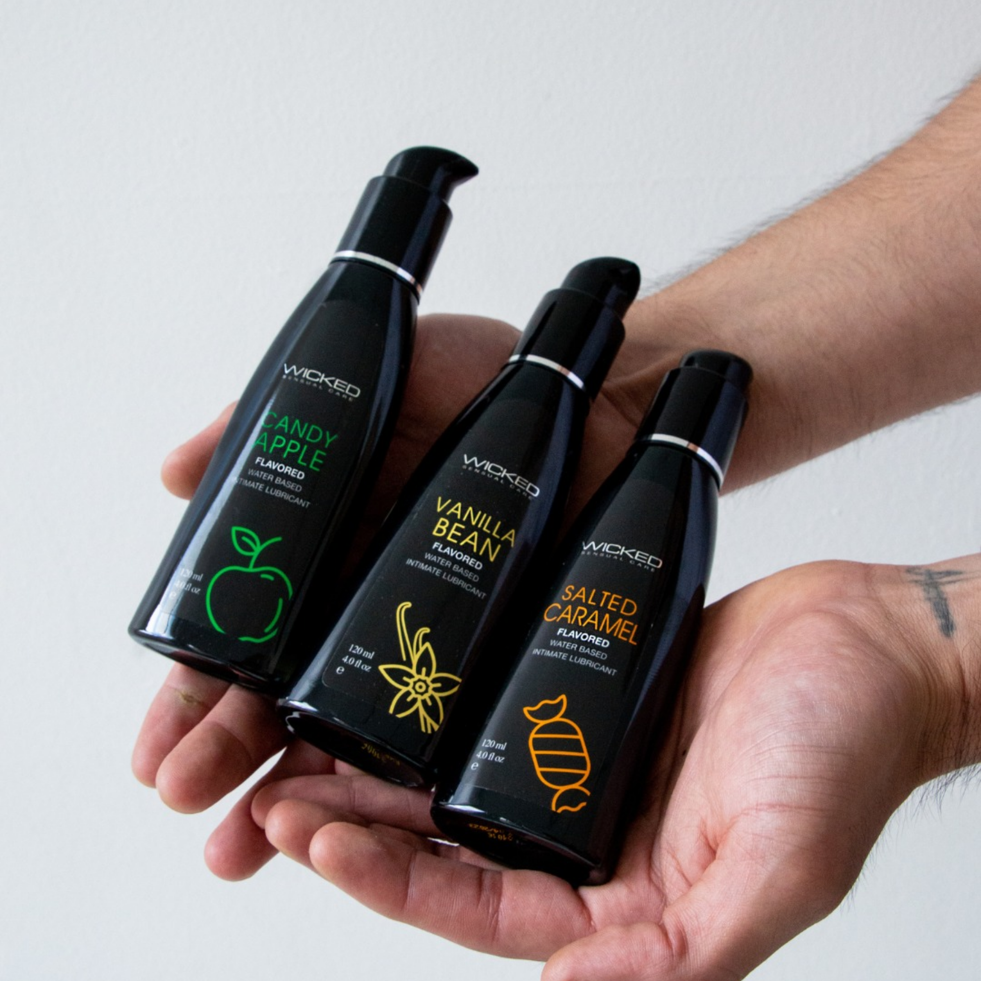Kissable, lickable, and delicious Wicked Aqua personal lubricant adds subtle and delicious natural flavors to enhance oral pleasures. Light and silky, this water-based formula is the perfect sensual combination of an elegant lubricant and a flavor sensation. Never sticky and without an aftertaste, Wicked Aqua satisfies your sweet tooth and your intimate desires all in one amazing pleasure product. Oral sex never tasted so good. Whether you are giving or receiving, our flavors will give you a new sexy confidence.